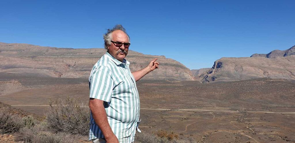 We sleep late the next morning and then have a hearty breakfast outside under the veranda. Danny wants to go and see Prince Albert, a town about half an hour away. Frans invites me to join him up the hill in his 4×4 – he wants to show me the new road he is making across part of his farm (the town is situated on his farm, De Klarestroom, and to a great extent the town also belongs to him). He had quite a scare a couple of days ago when he tried the new road just after the bulldozer made its way up the steep hill. The road surface was not settled yet and gave way under his Land Cruiser. Fortunately he made it.