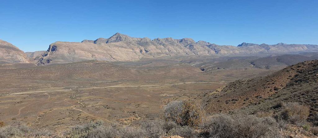As the two of us make it up the hill we get to the point where he had the bad experience. He has to pick up some speed to make it up the slope and I cannot help but to consider the odds of surviving this. But the road is much more settled now and we reach the summit without incident. We get out and I am blown away by the beauty of the view. Below us you can see the Klaarstroom to Willowmore road with the Swartberg mountain range in the back and the Meiringspoort that provides access between the Great Karoo and the Little Karoo. When you drive through Meiringspoort, crossing the small river 25 times in 25 kilometers, you realise that a lot of water must have passed a long time ago from the Great Karoo towards the Little Karoo through this gap. During the rainy season this small river becomes a torrent and floods all the low water bridges and no-one can pass.