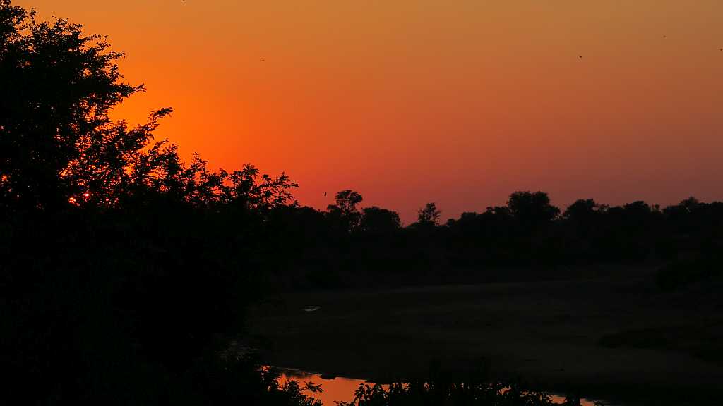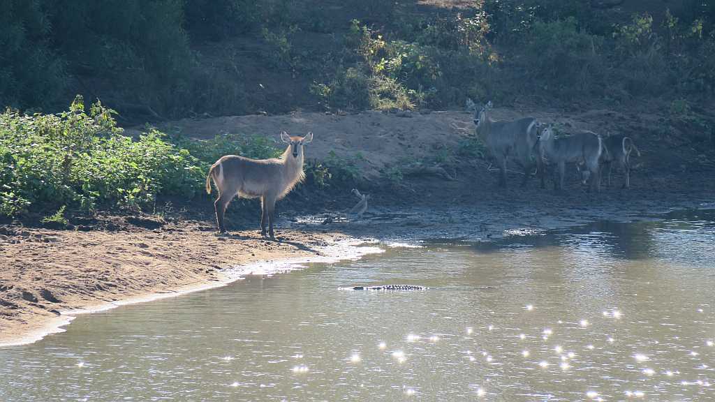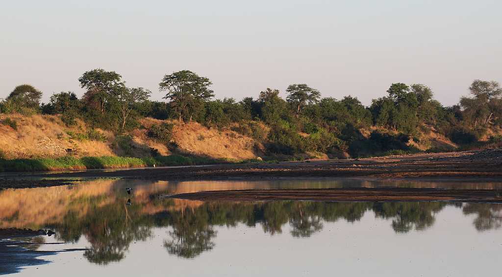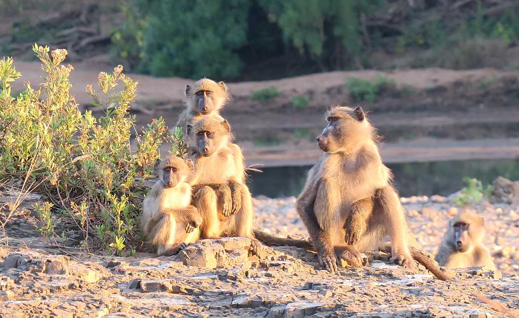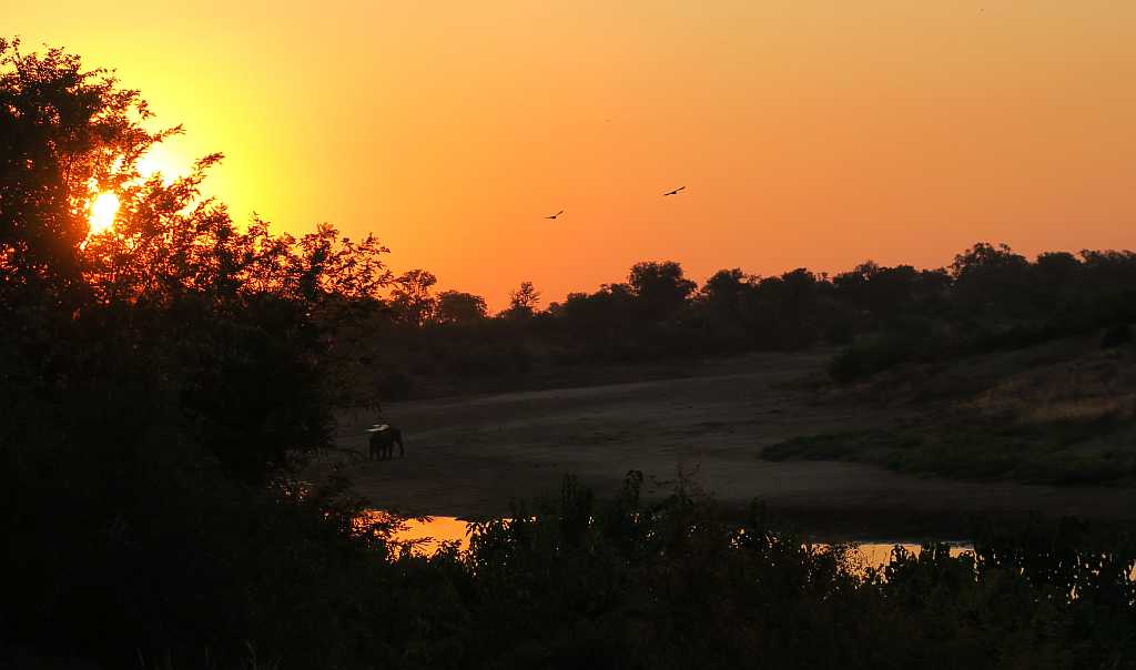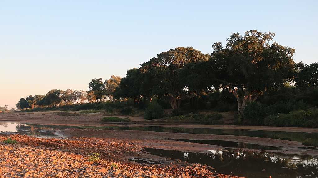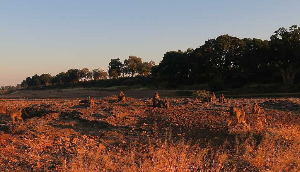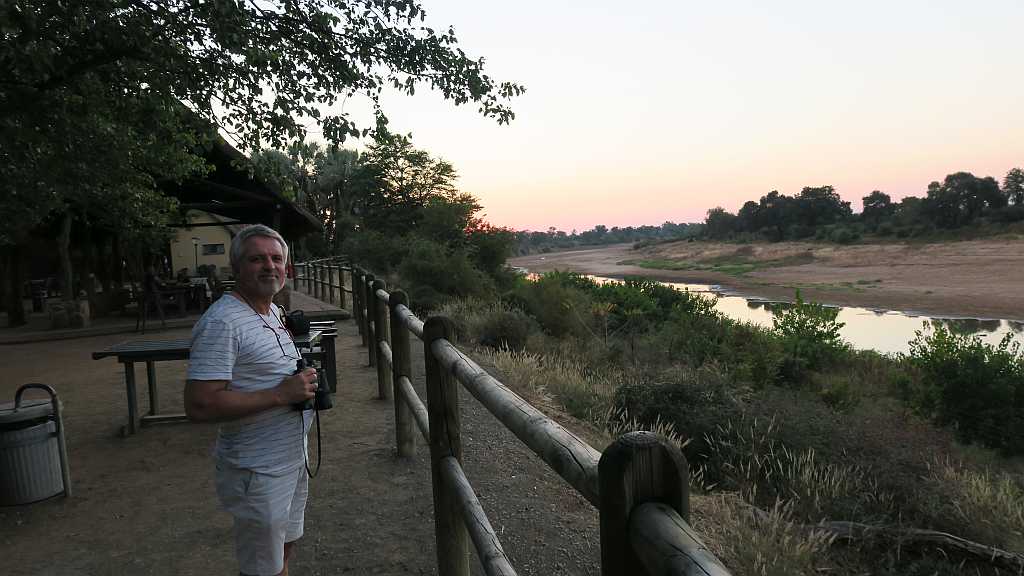 The road takes us far around the camp, but we find no lions (we heard later that we were going in the right direction but missed them). We cross the Shingwedzi river just behind the camp and run into a troop of baboons sitting leisurely on the river bank next to the low water bridge admiring the sunrise. Interesting how much we are alike! We return to the camp for breakfast, seeing nothing more than the usual elephants, water buck and the like (sigh, we are spoiled by a week in the Kruger). We spend some time during the day to explore the camp and facilities and chatting with the camp manager. We also take a long time to observe the wild life on the other side of the Shingwedzi river from the camp’s lookout deck.