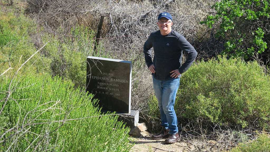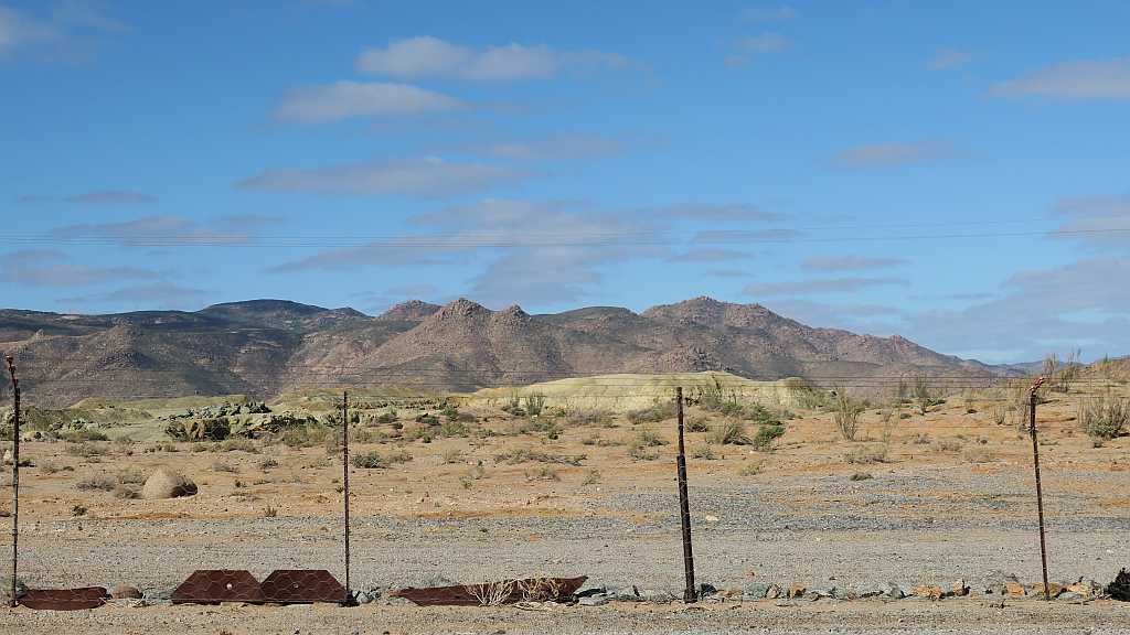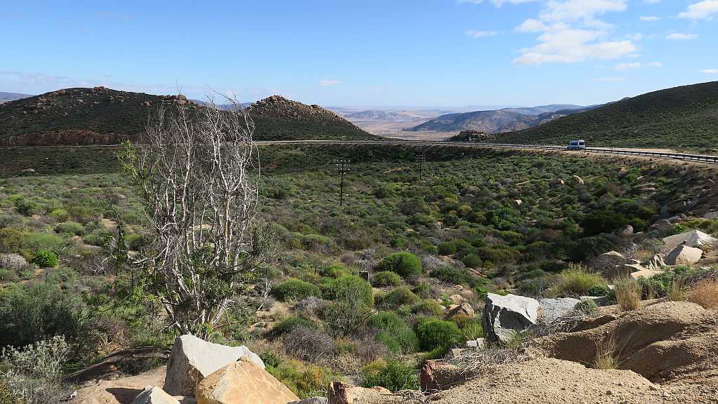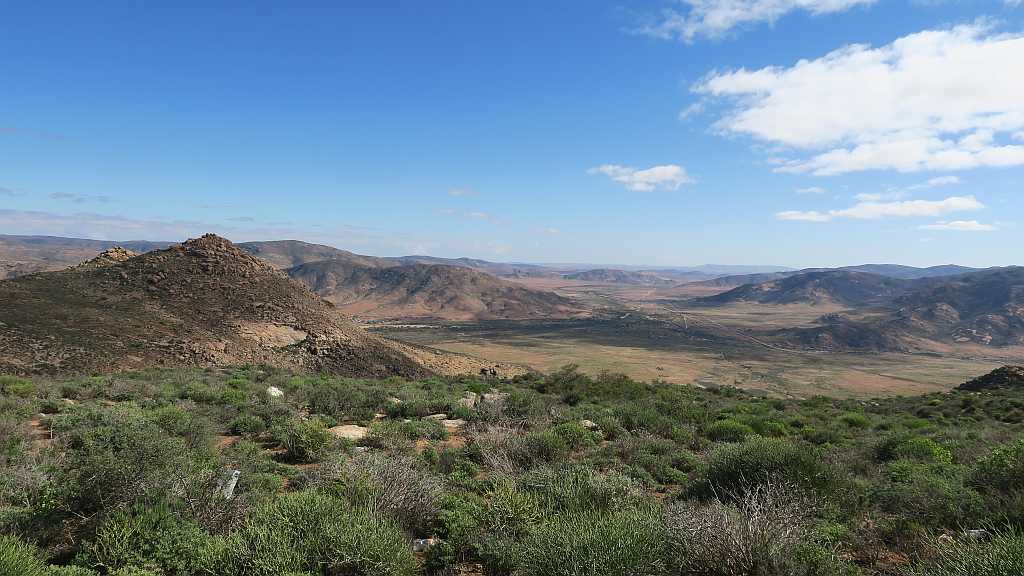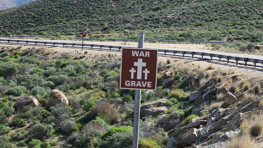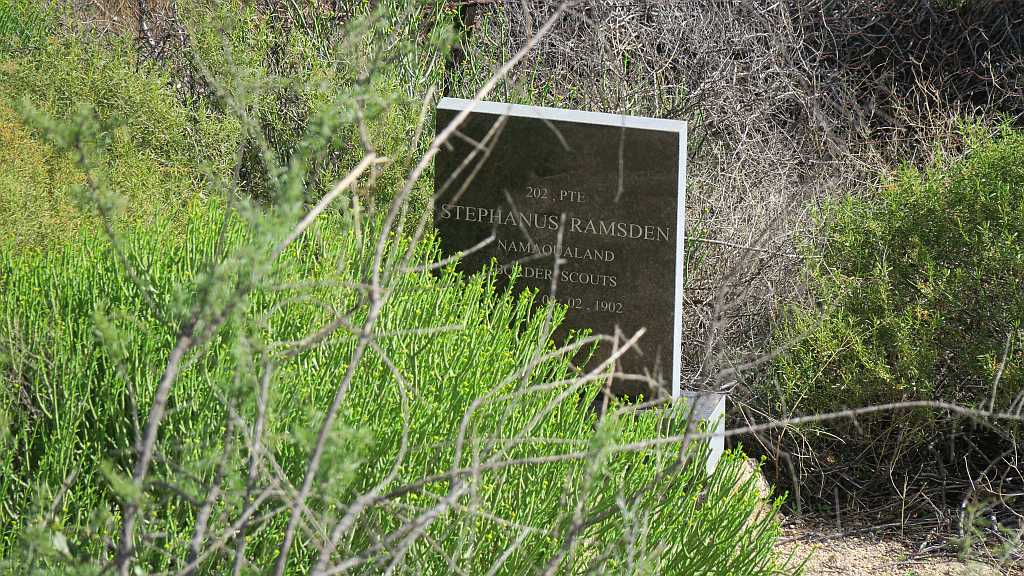 Halfway down the hill we stop. There is a sign indicating a war grave. A local farmer collaborated with the British during the Second Anglo-Boer War as a Namaqualand Border Scout. He was informing the Brits on the positions of Boers in the area. He was executed and buried here by Boer supporters in 1902.