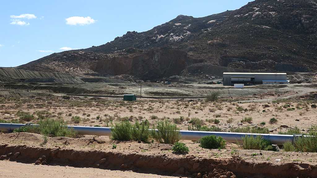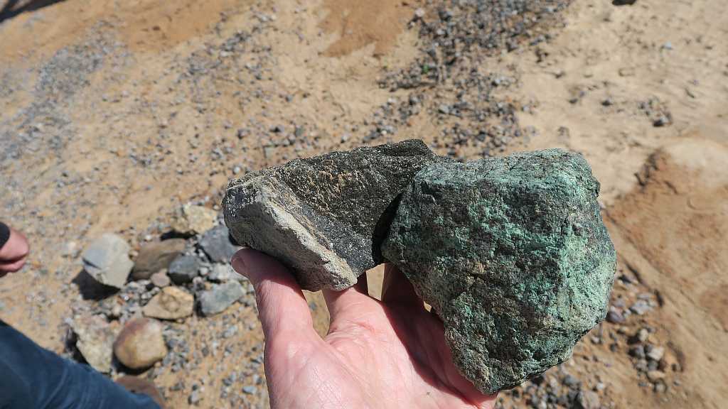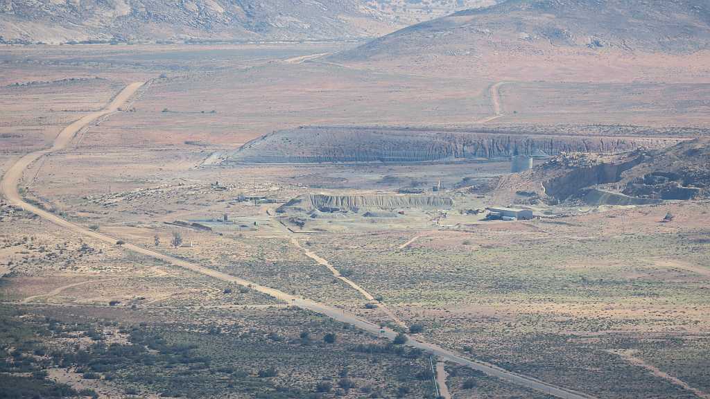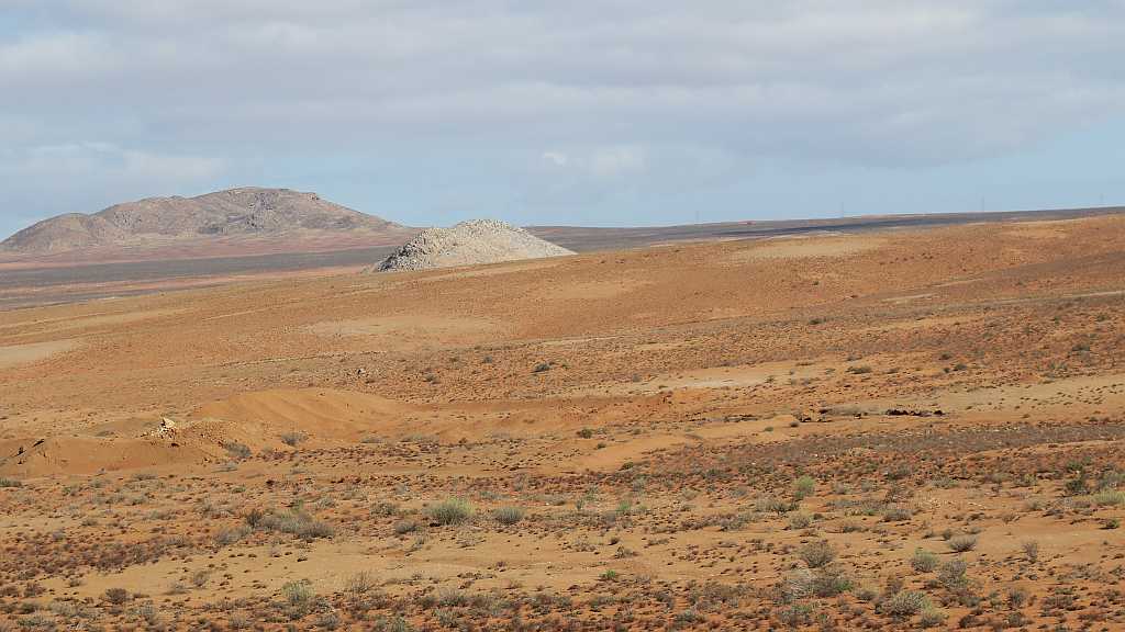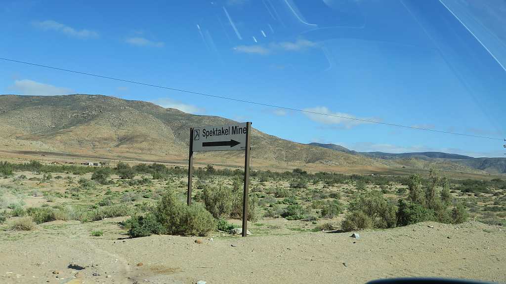 A couple of kilometers further down the road, just after it turns to gravel, we turn right into the Spektakel mining site. This is an old copper mine and you can still see the shaft declining into the side of the hill. The area is strewn with little rocks with the blue-green tint of copper ore. There are a number of these old mines in Namaqualand.