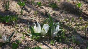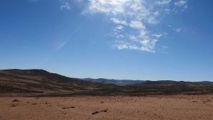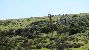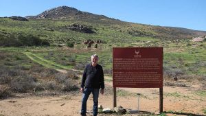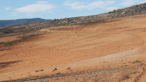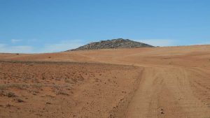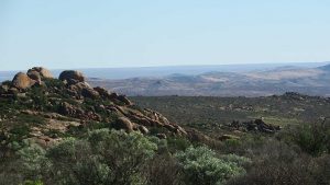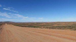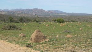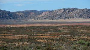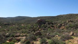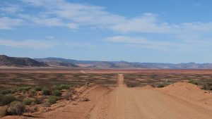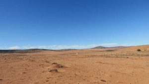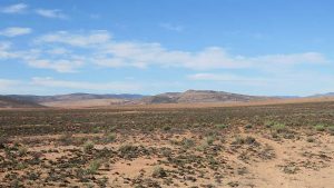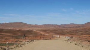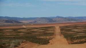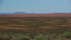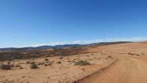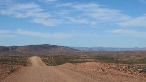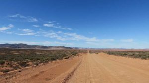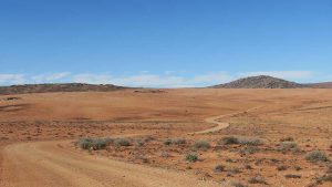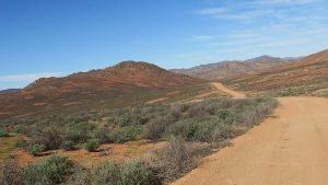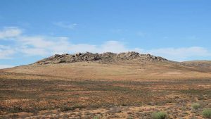 Then we exit town on its west side and turn left on the road to Soebatsfontein. This is a long dirt road crossing many low hills on an otherwise flat plain. At times we pass along the Namaqua National Park borders. The park is growing with new areas being proclaimed – it stretches now to the West Coast. After a long drive we reach Soebatsfontein. I can see where its name came from (“soebat” in Afrikaans meaning to plead intensely). It is a very poor area and I guess its fountain was probably the only source of water in the area. The little village is at one of the entrance gates to the Namakwa National Park.
