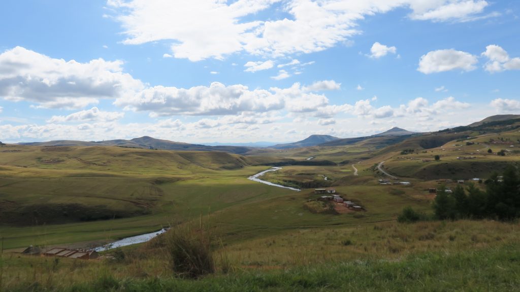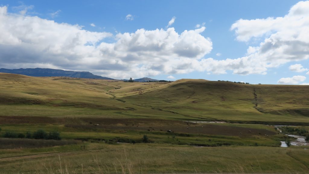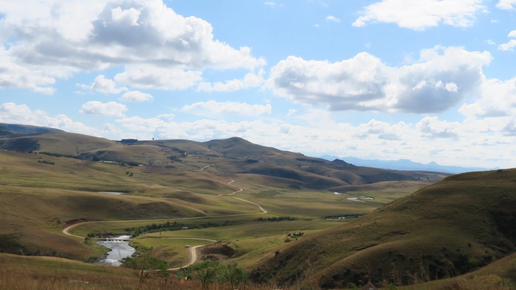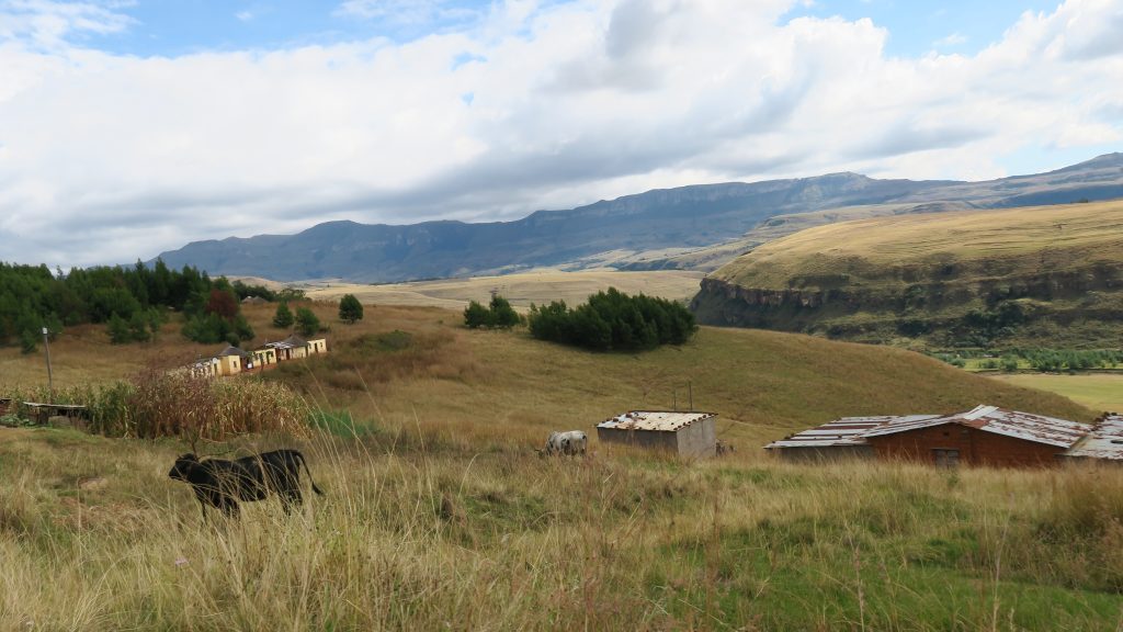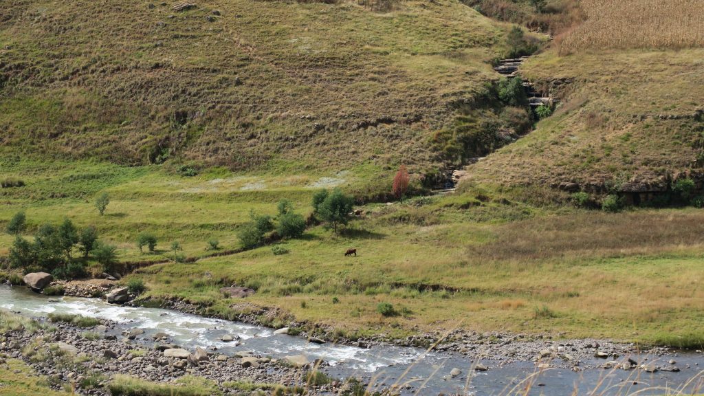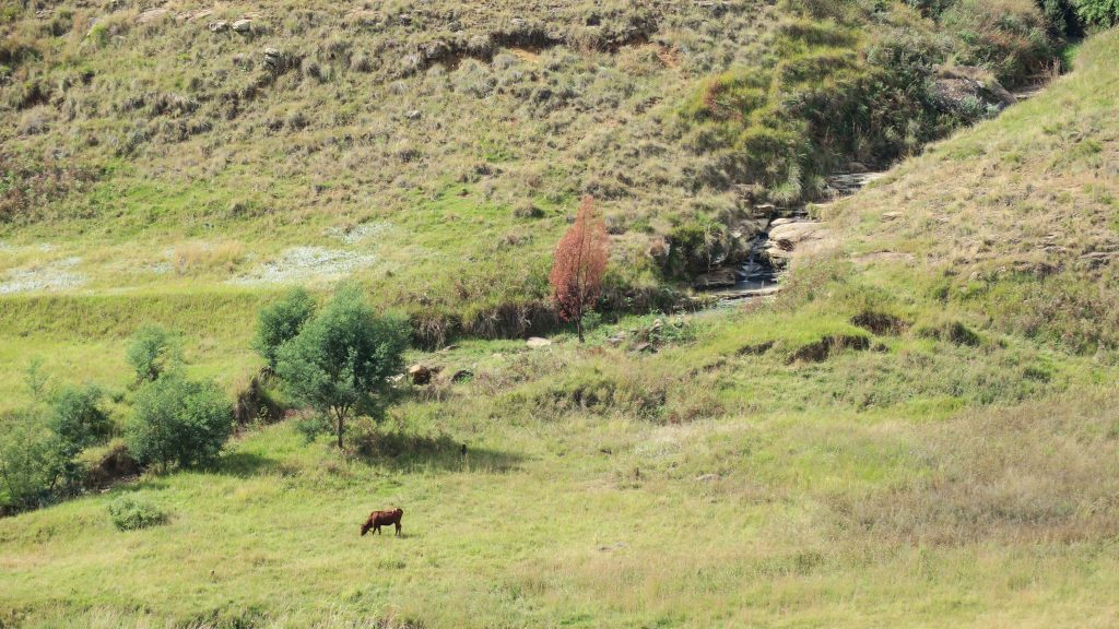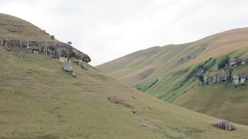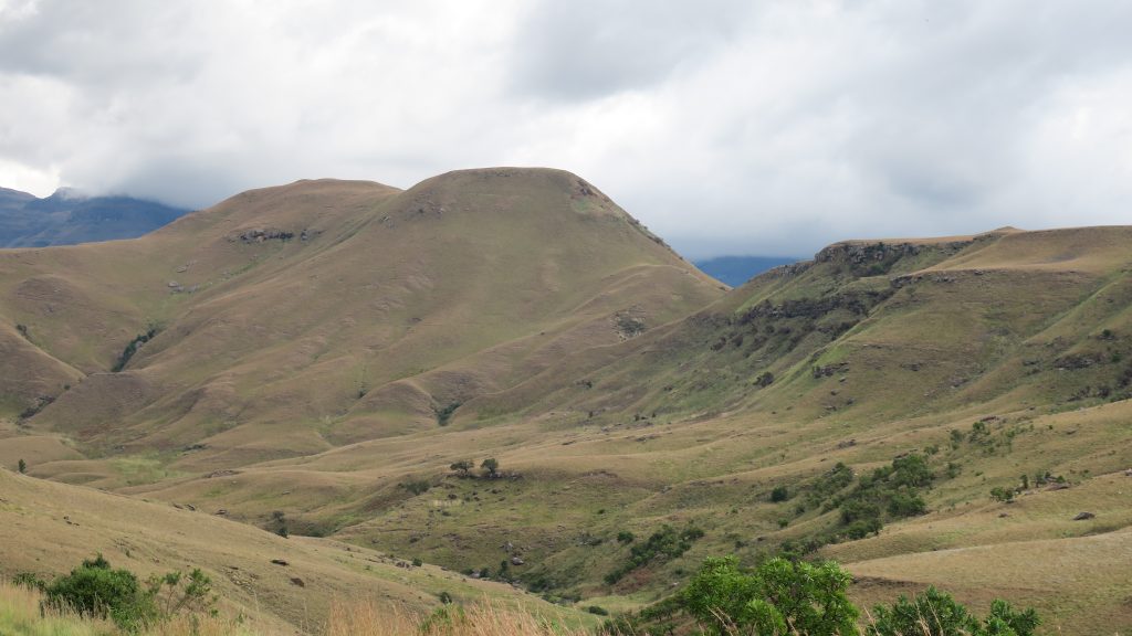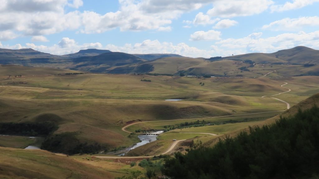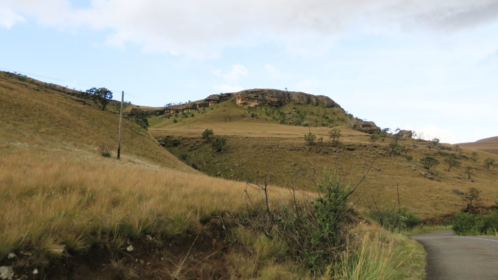 We take the road towards Didima. In these rural areas you have to drive very carefully – children and animals are all over the place and, if that is not enough, unmarked speed bumps appear out of nowhere. The speed limit (that is, if there is one visibly displayed) is usually much higher than these speed bumps are built for – the intention is for you to slow down where children may be crossing. So if you are approaching some built-up area (and it could be a very small settlement) slow down because your car suspension will regret it! Due to recent flooding, some places in the road higher up in the mountain have lost one side of the road that slid down-hill but it is all well-marked. But the drive is not as hair-raising as it may sound. The area is so, so beautiful – small rivers running amongst the green Drakensberg foothills with small settlements spread here and there. Your soul feels nourished by what your eyes see.