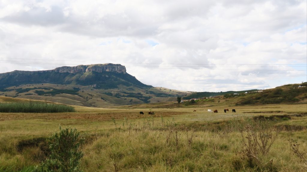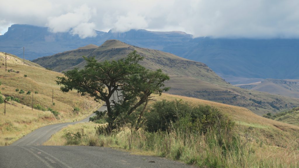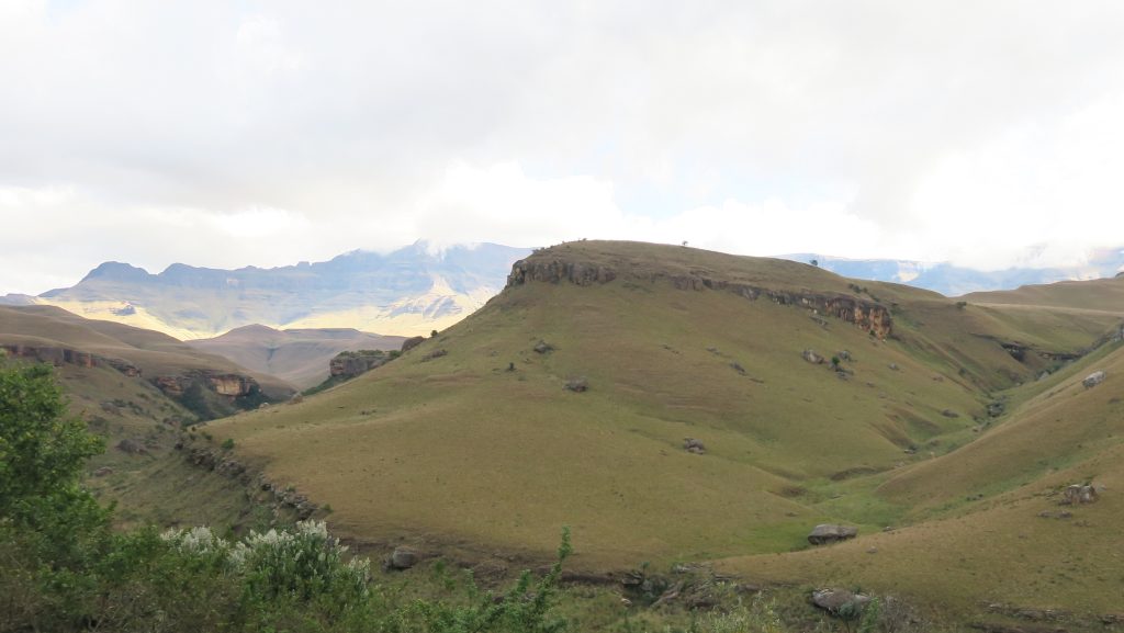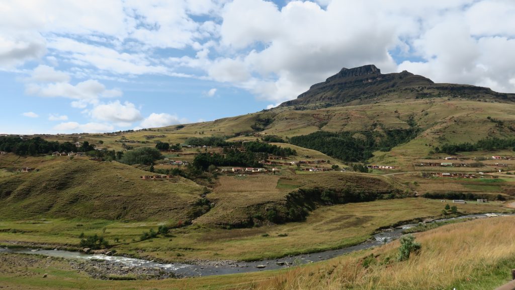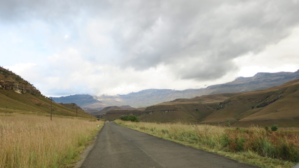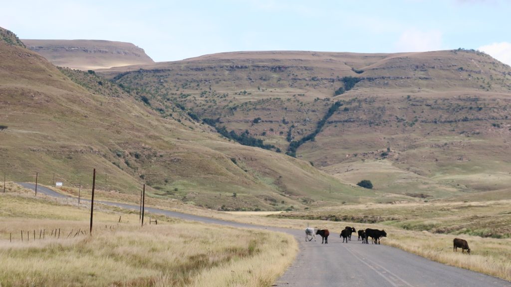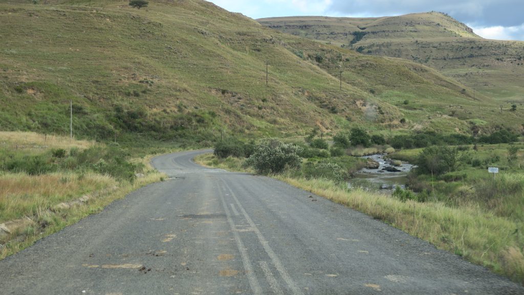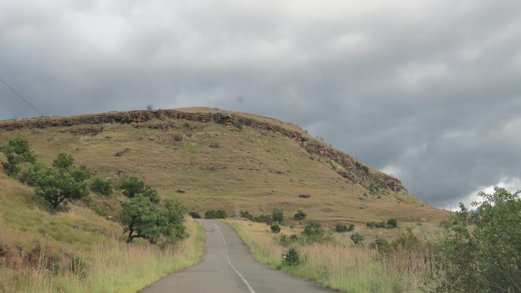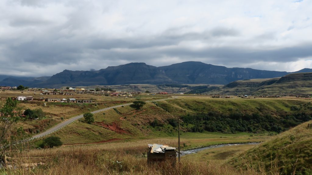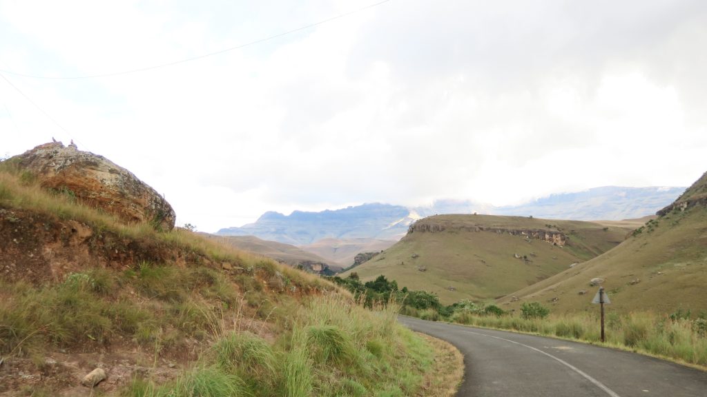 We take the road towards Didima. In these rural areas you have to drive very carefully – children and animals are all over the place and, if that is not enough, unmarked speed bumps appear out of nowhere. The speed limit (that is, if there is one visibly displayed) is usually much higher than these speed bumps are built for – the intention is for you to slow down where children may be crossing. So if you are approaching some built-up area (and it could be a very small settlement) slow down because your car suspension will regret it! Due to recent flooding, some places in the road higher up in the mountain have lost one side of the road that slid down-hill but it is all well-marked. But the drive is not as hair-raising as it may sound. The area is so, so beautiful – small rivers running amongst the green Drakensberg foothills with small settlements spread here and there. Your soul feels nourished by what your eyes see.