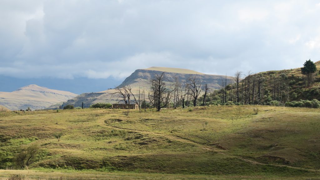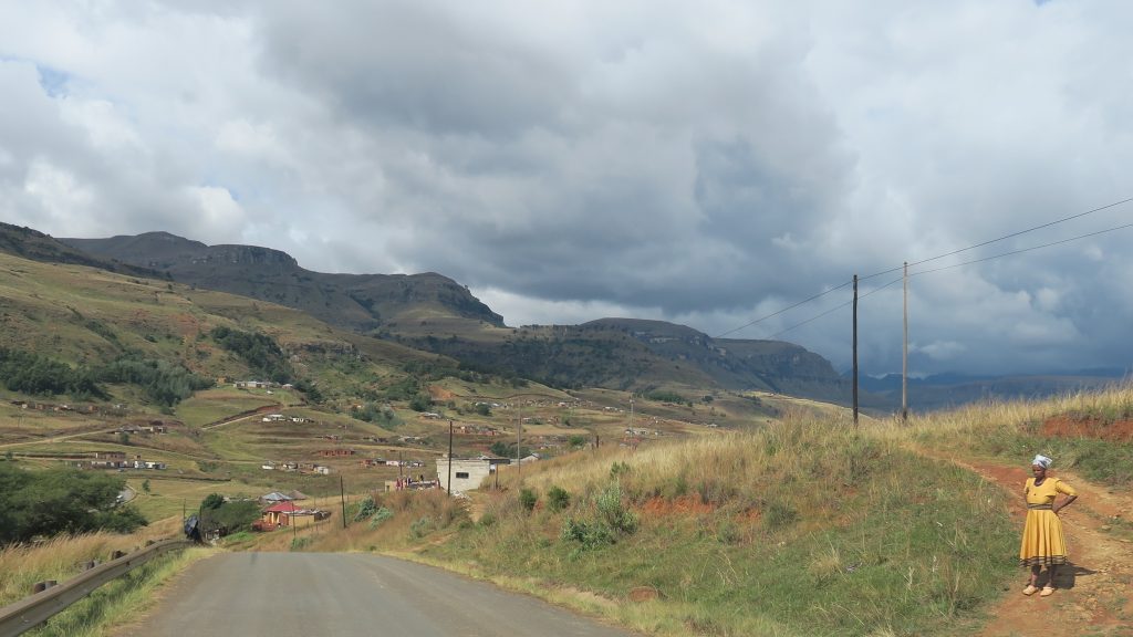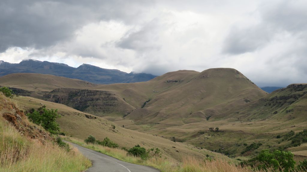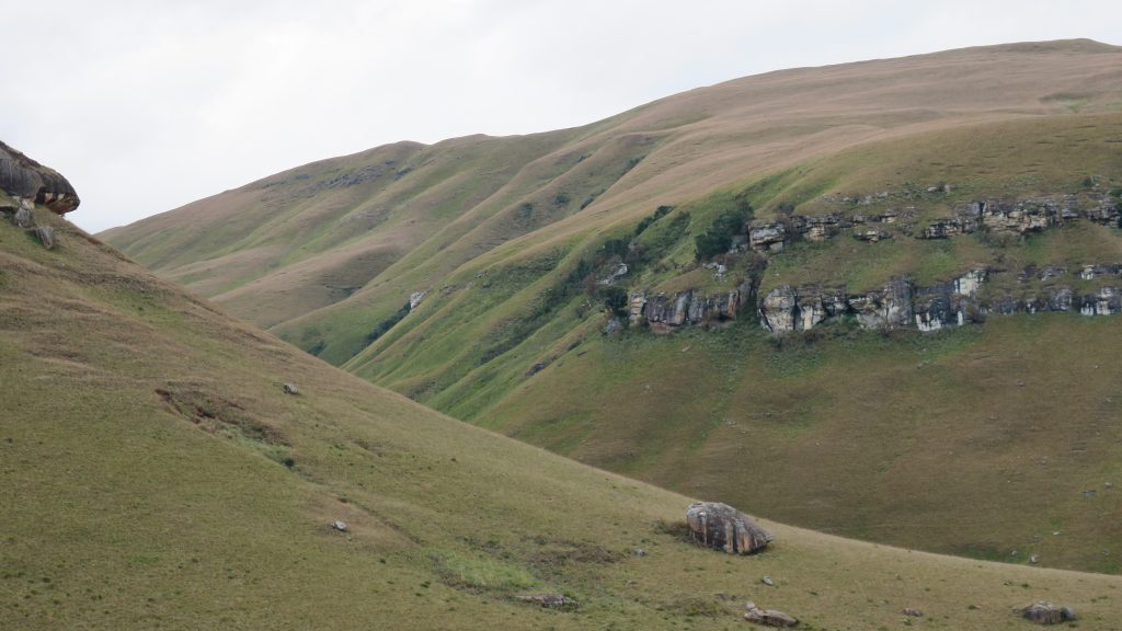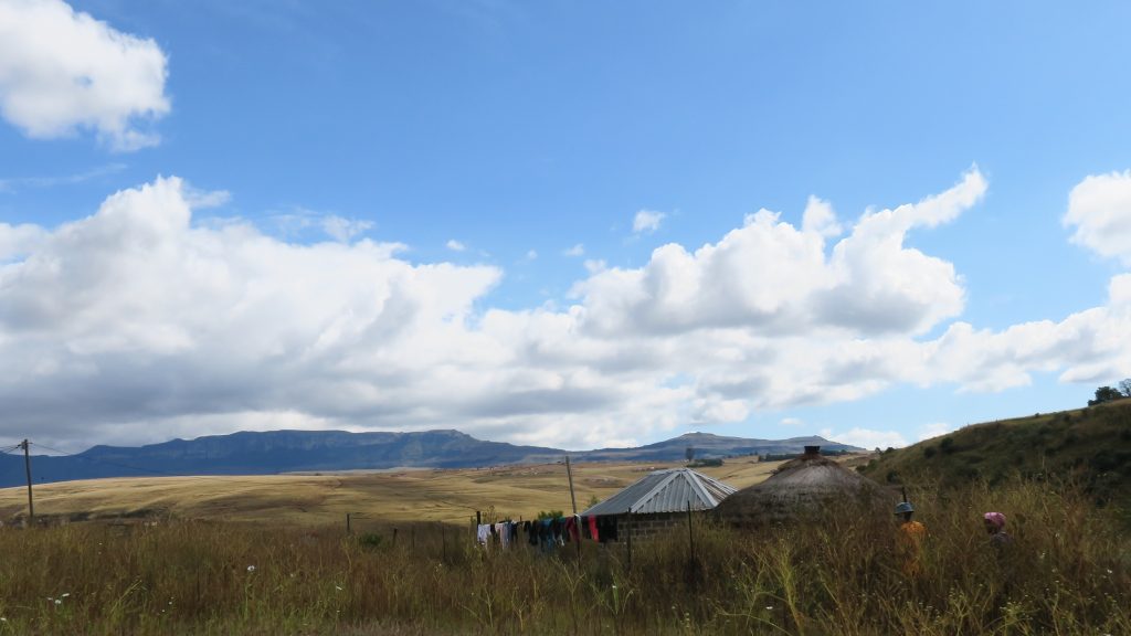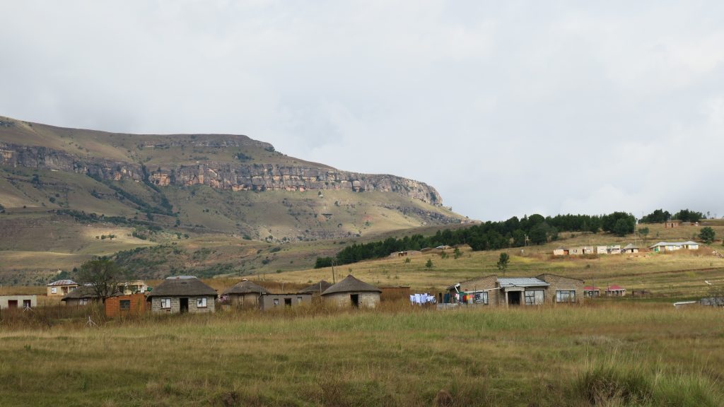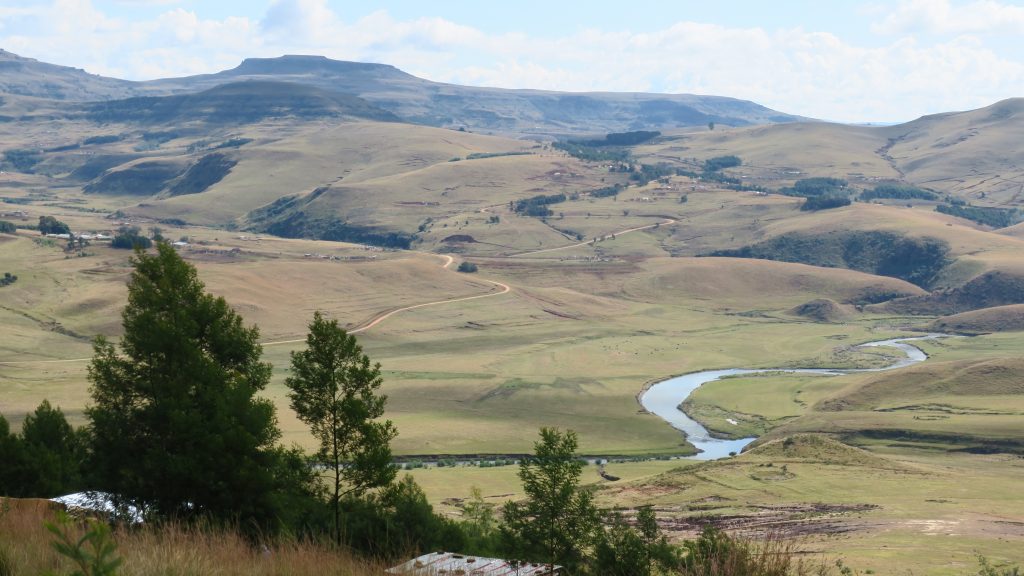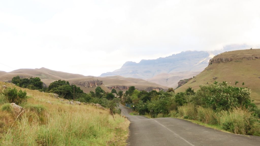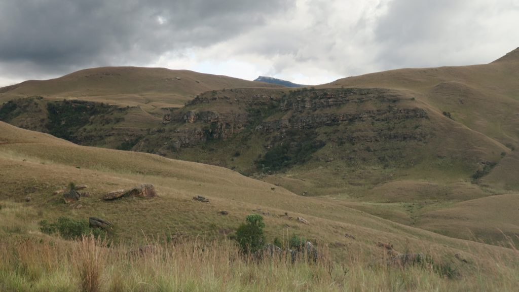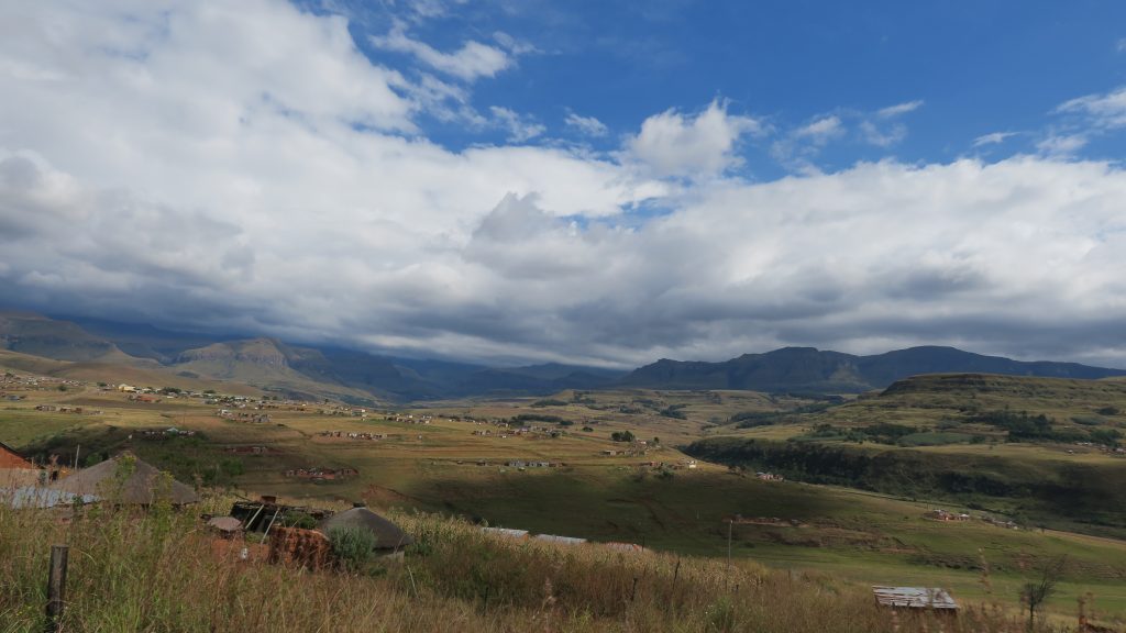 We take the road towards Didima. In these rural areas you have to drive very carefully – children and animals are all over the place and, if that is not enough, unmarked speed bumps appear out of nowhere. The speed limit (that is, if there is one visibly displayed) is usually much higher than these speed bumps are built for – the intention is for you to slow down where children may be crossing. So if you are approaching some built-up area (and it could be a very small settlement) slow down because your car suspension will regret it! Due to recent flooding, some places in the road higher up in the mountain have lost one side of the road that slid down-hill but it is all well-marked. But the drive is not as hair-raising as it may sound. The area is so, so beautiful – small rivers running amongst the green Drakensberg foothills with small settlements spread here and there. Your soul feels nourished by what your eyes see.