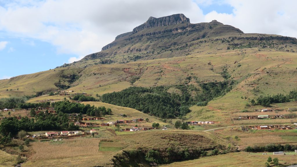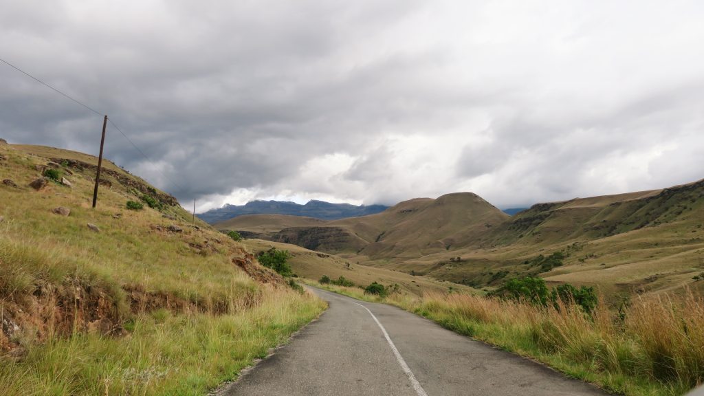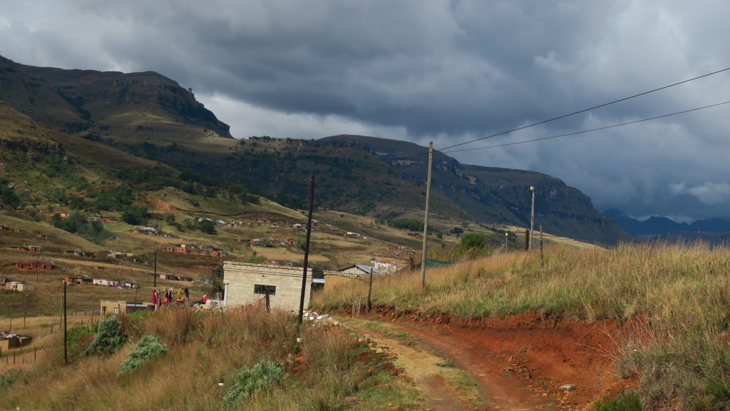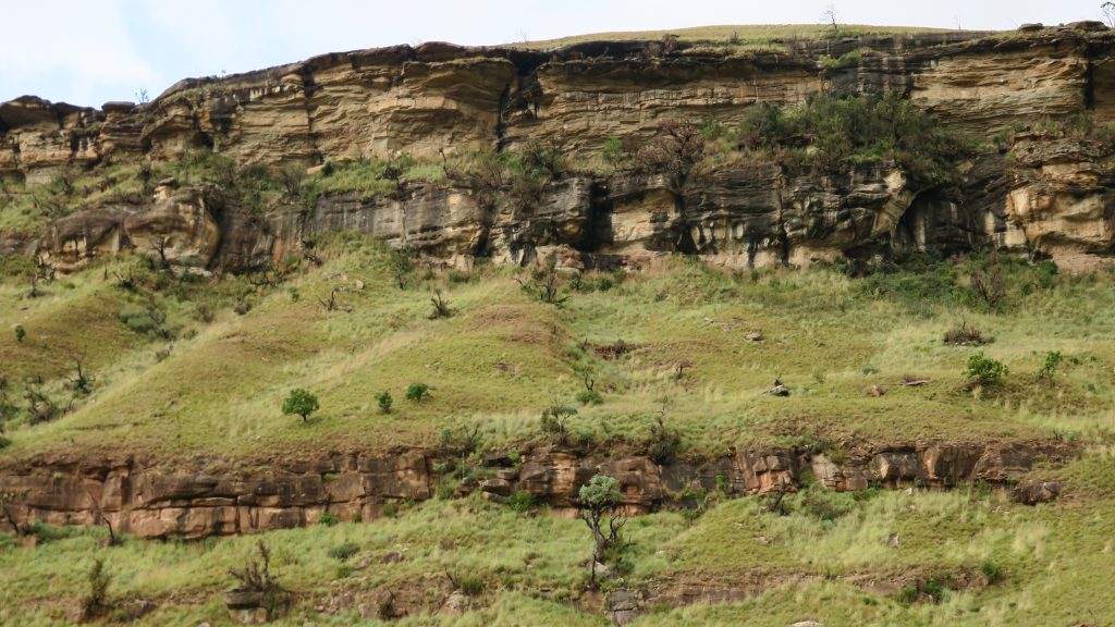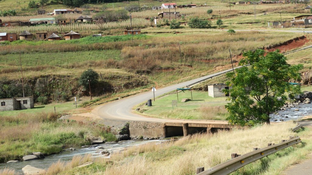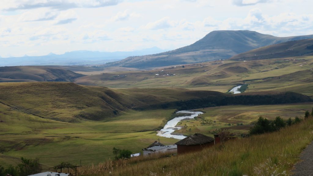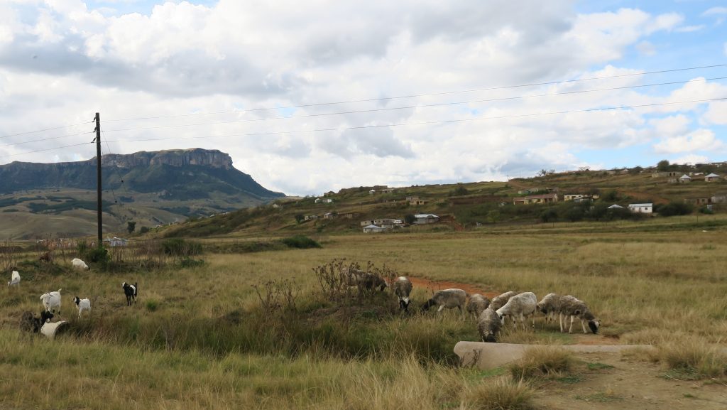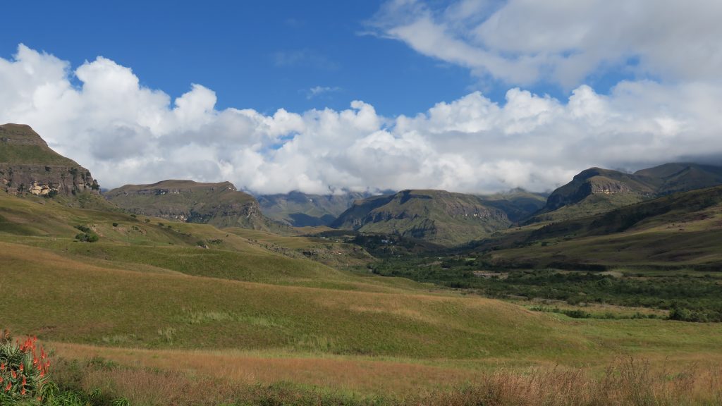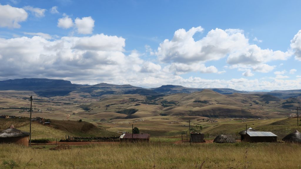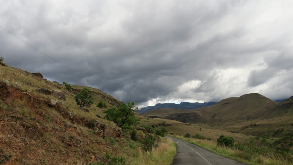 We take the road towards Didima. In these rural areas you have to drive very carefully – children and animals are all over the place and, if that is not enough, unmarked speed bumps appear out of nowhere. The speed limit (that is, if there is one visibly displayed) is usually much higher than these speed bumps are built for – the intention is for you to slow down where children may be crossing. So if you are approaching some built-up area (and it could be a very small settlement) slow down because your car suspension will regret it! Due to recent flooding, some places in the road higher up in the mountain have lost one side of the road that slid down-hill but it is all well-marked. But the drive is not as hair-raising as it may sound. The area is so, so beautiful – small rivers running amongst the green Drakensberg foothills with small settlements spread here and there. Your soul feels nourished by what your eyes see.