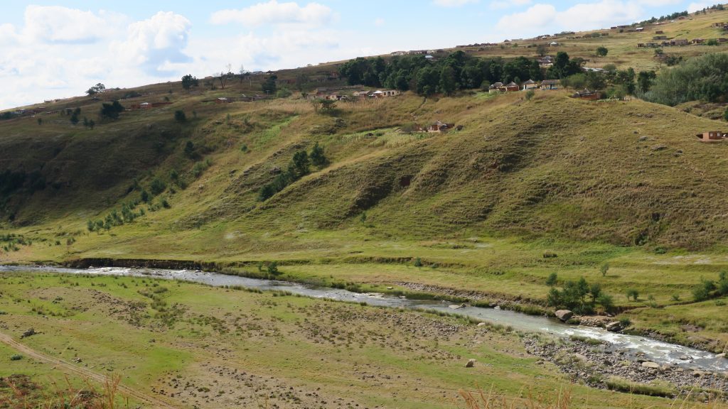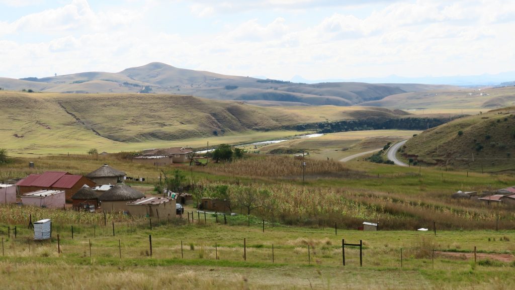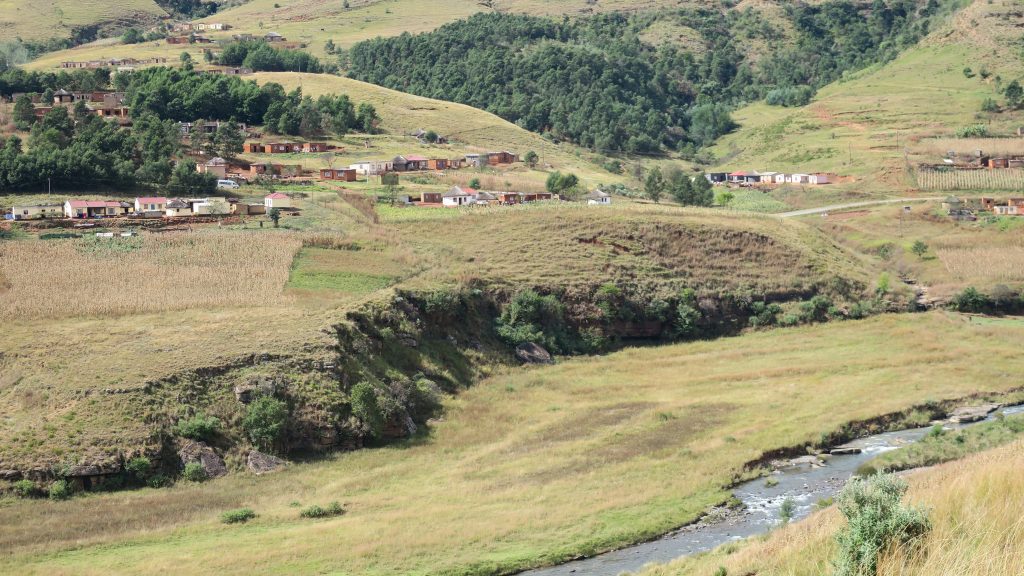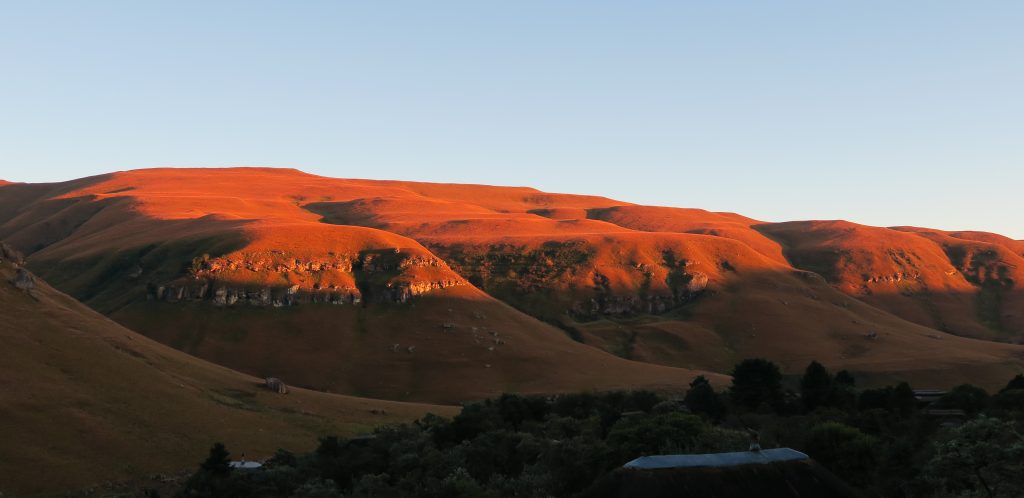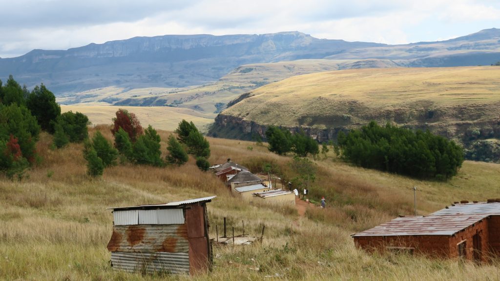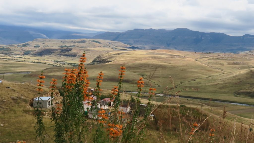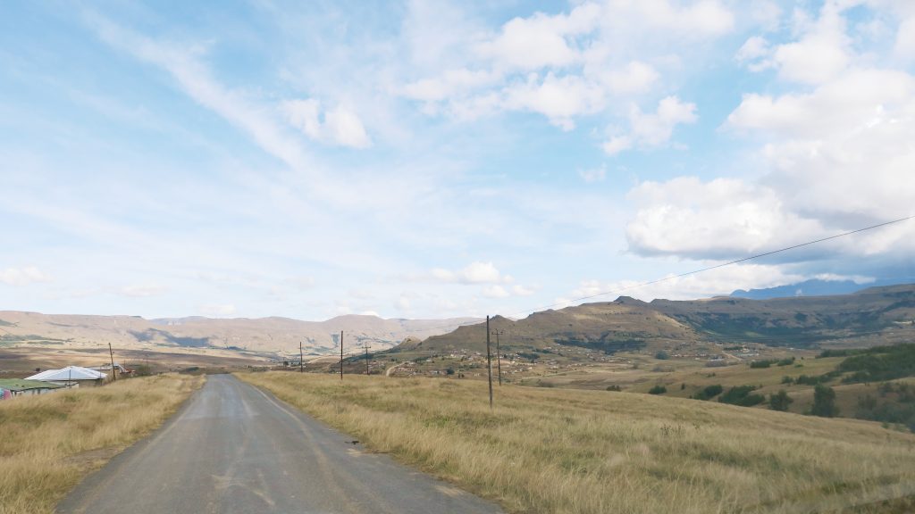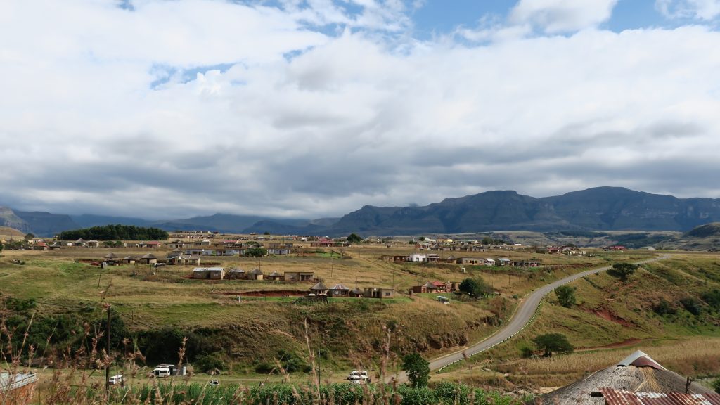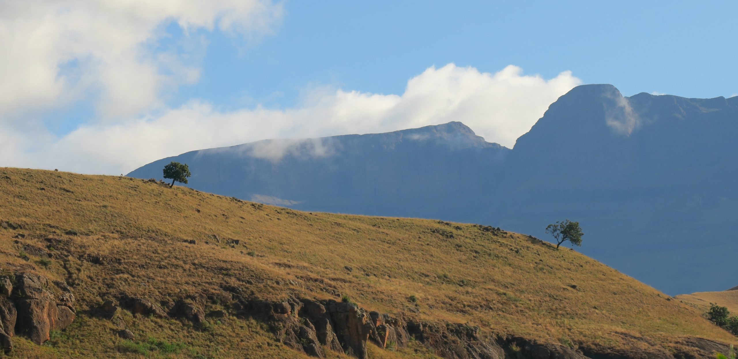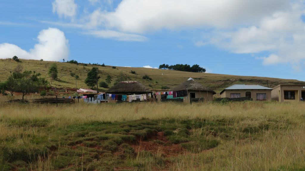 We take the road towards Didima. In these rural areas you have to drive very carefully – children and animals are all over the place and, if that is not enough, unmarked speed bumps appear out of nowhere. The speed limit (that is, if there is one visibly displayed) is usually much higher than these speed bumps are built for – the intention is for you to slow down where children may be crossing. So if you are approaching some built-up area (and it could be a very small settlement) slow down because your car suspension will regret it! Due to recent flooding, some places in the road higher up in the mountain have lost one side of the road that slid down-hill but it is all well-marked. But the drive is not as hair-raising as it may sound. The area is so, so beautiful – small rivers running amongst the green Drakensberg foothills with small settlements spread here and there. Your soul feels nourished by what your eyes see.