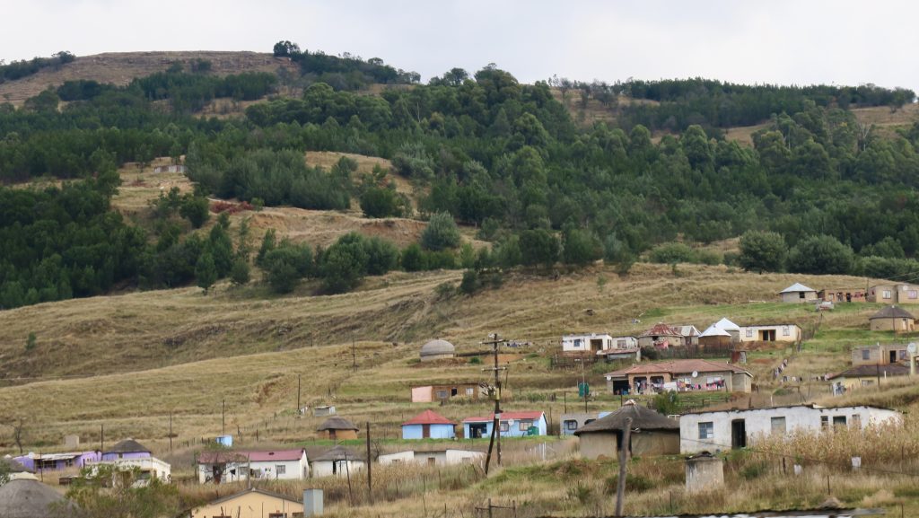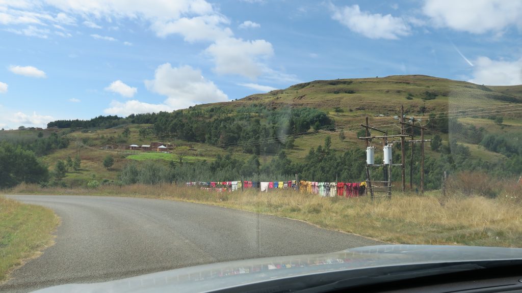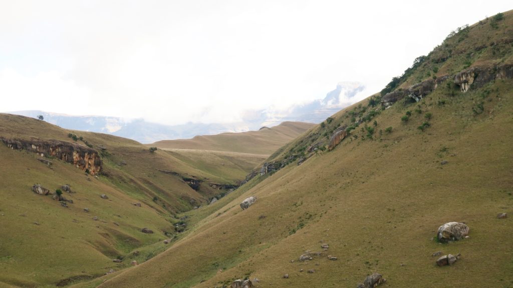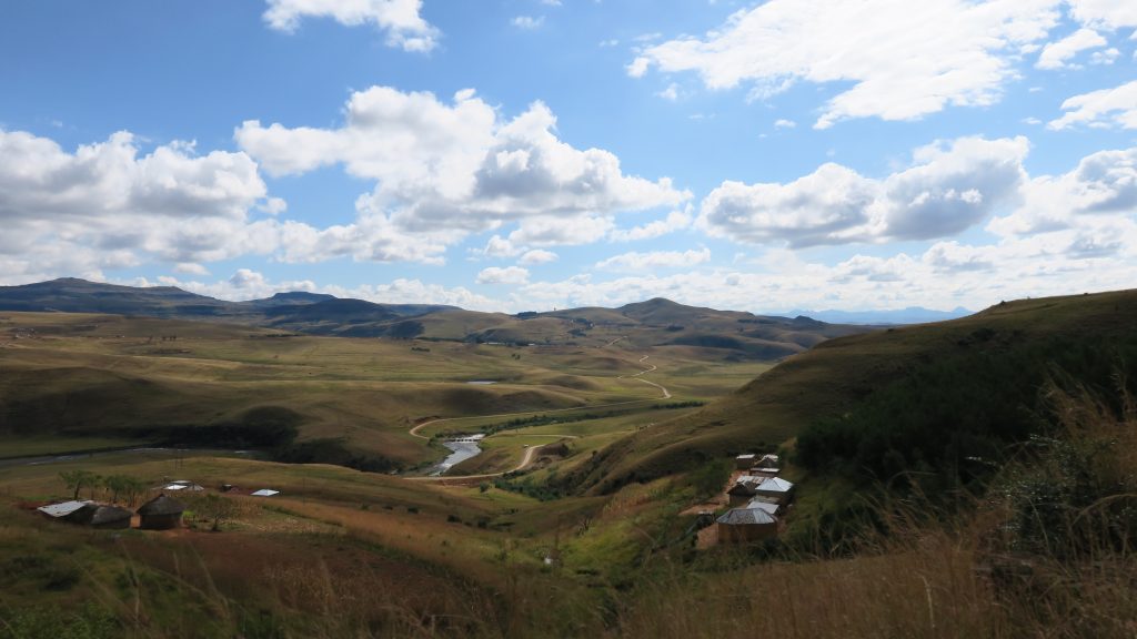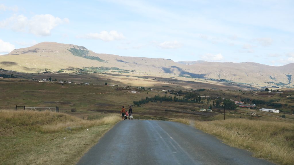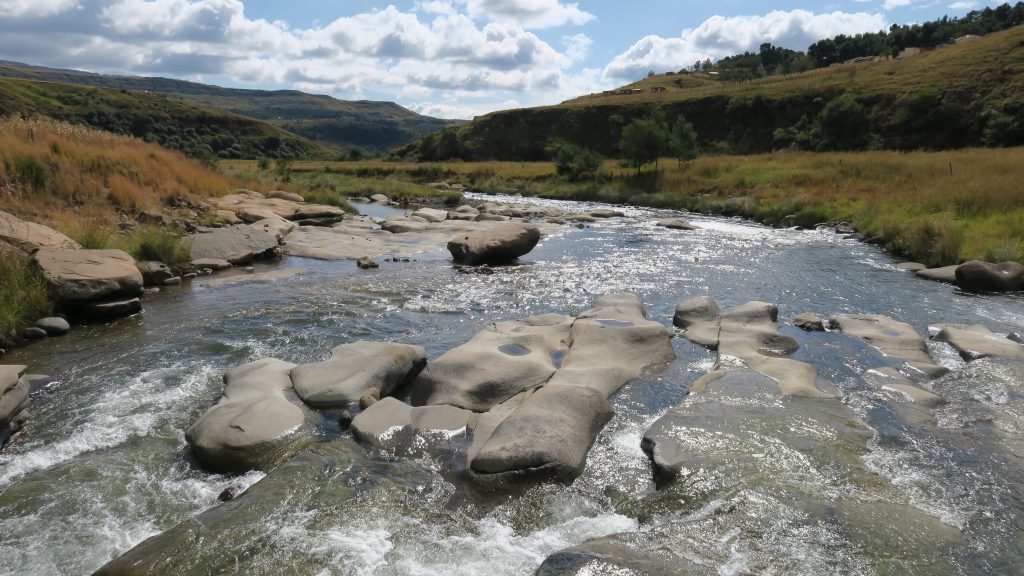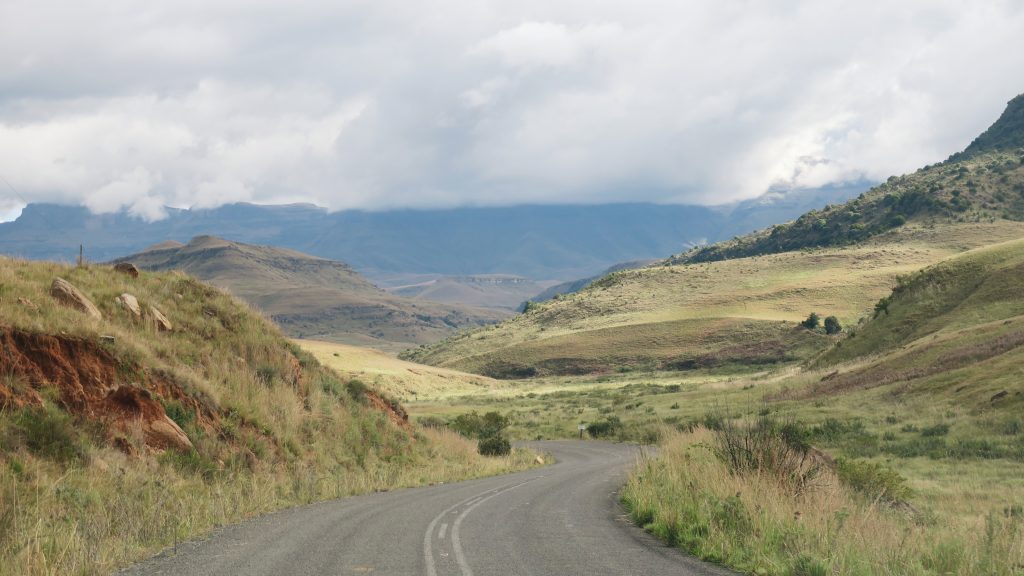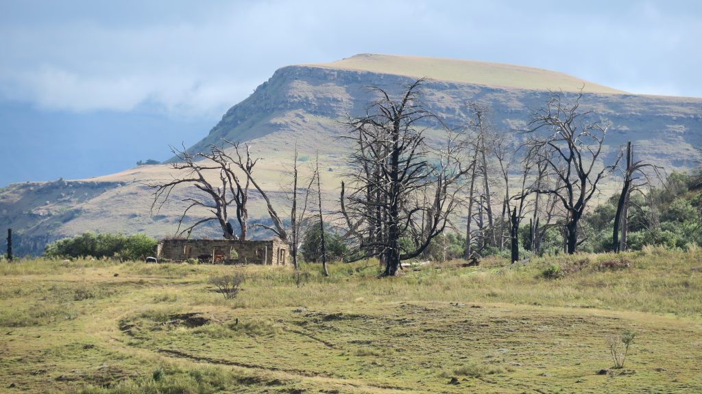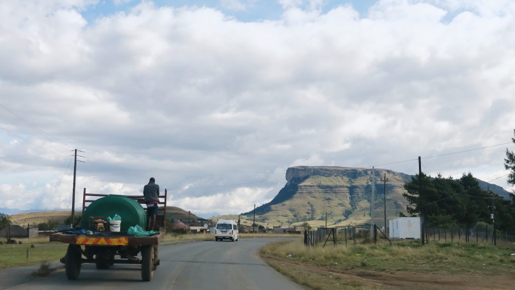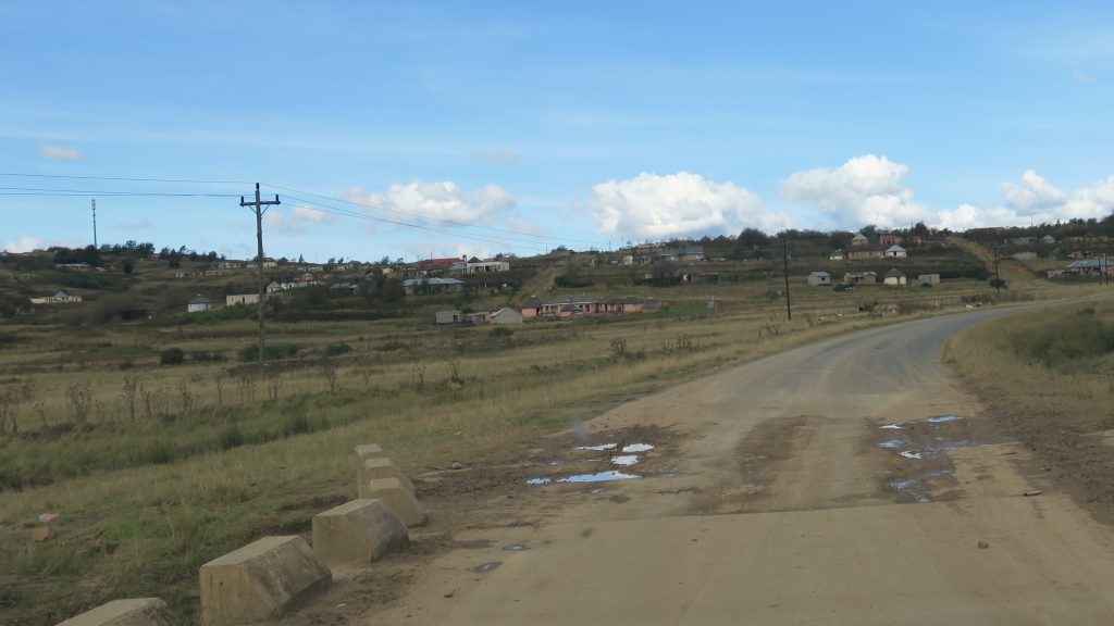 We take the road towards Didima. In these rural areas you have to drive very carefully – children and animals are all over the place and, if that is not enough, unmarked speed bumps appear out of nowhere. The speed limit (that is, if there is one visibly displayed) is usually much higher than these speed bumps are built for – the intention is for you to slow down where children may be crossing. So if you are approaching some built-up area (and it could be a very small settlement) slow down because your car suspension will regret it! Due to recent flooding, some places in the road higher up in the mountain have lost one side of the road that slid down-hill but it is all well-marked. But the drive is not as hair-raising as it may sound. The area is so, so beautiful – small rivers running amongst the green Drakensberg foothills with small settlements spread here and there. Your soul feels nourished by what your eyes see.