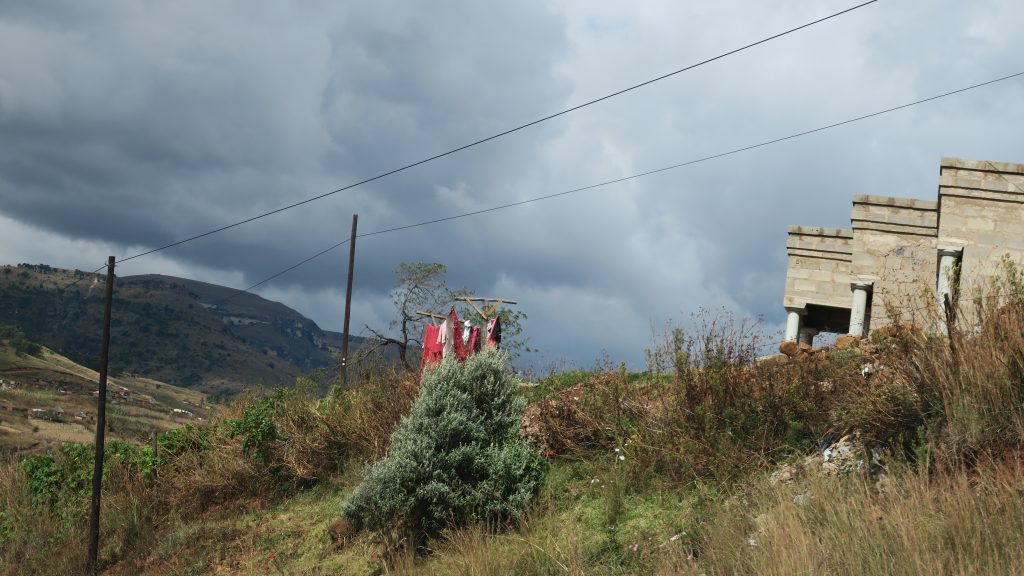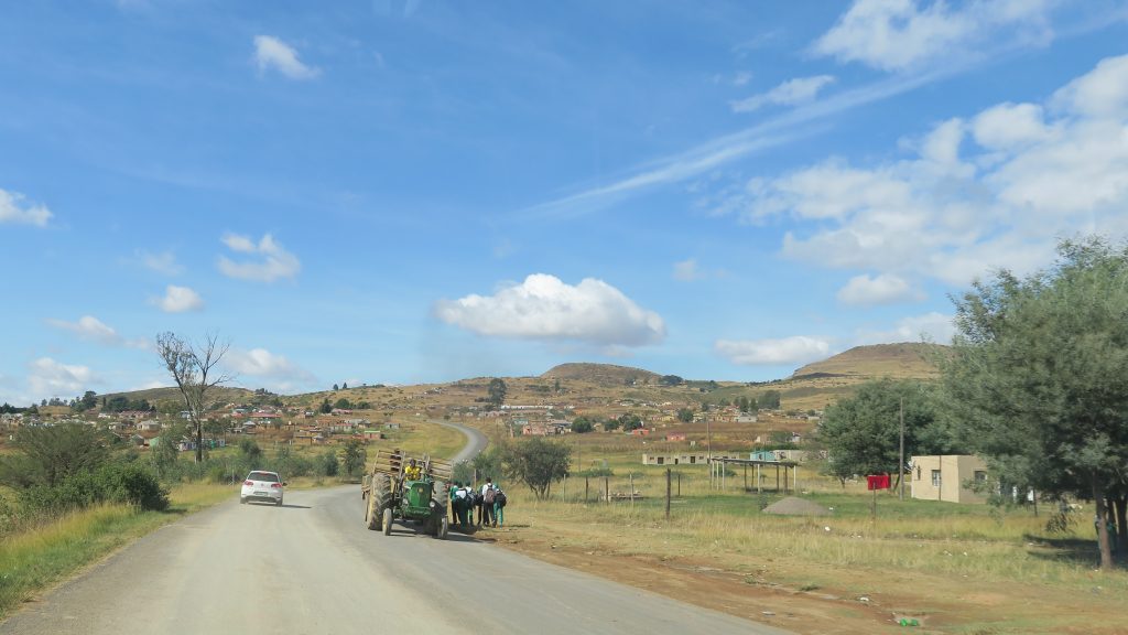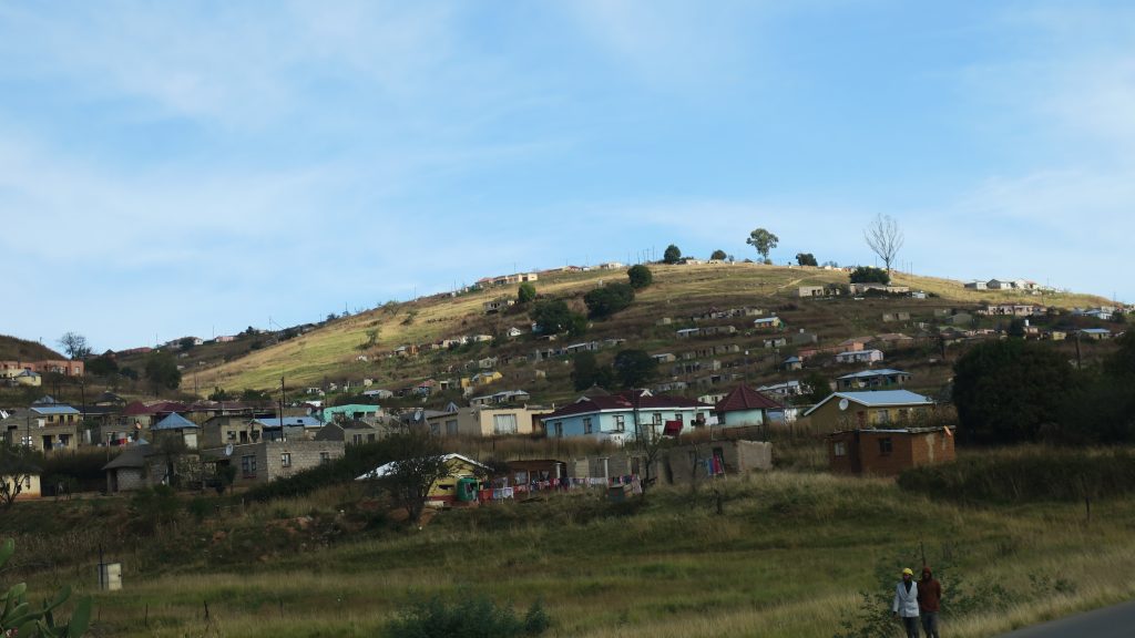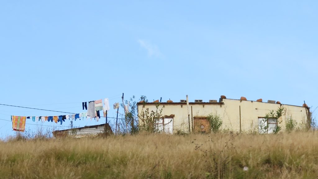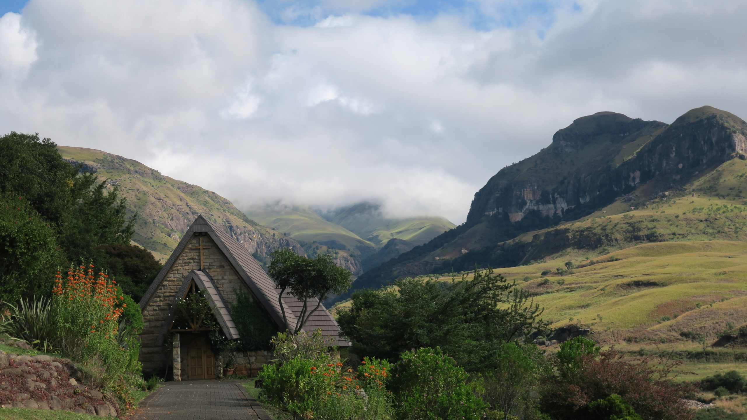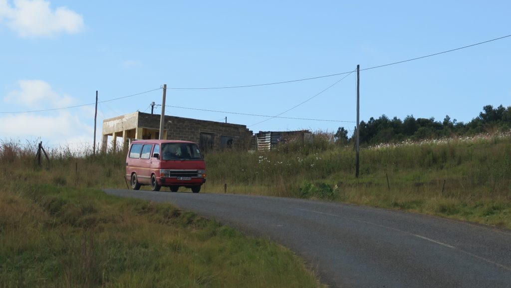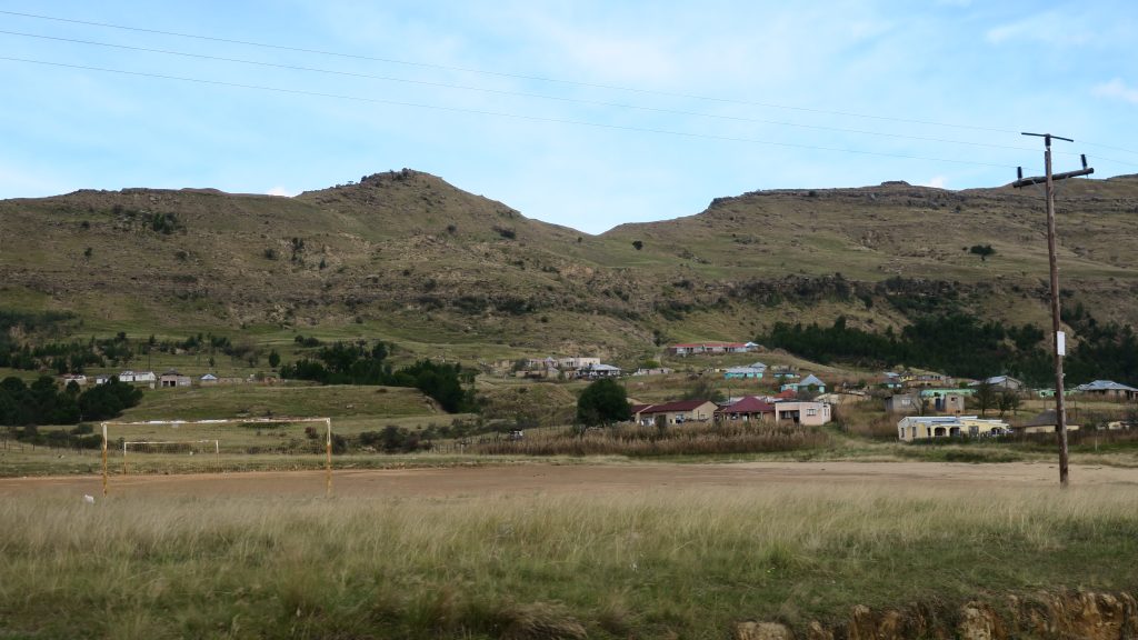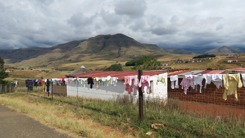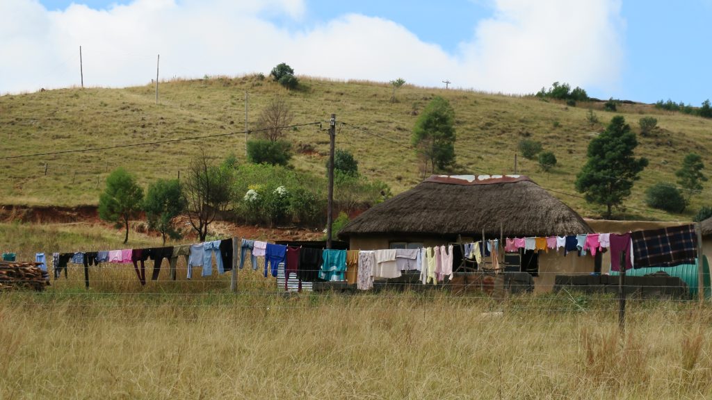 We take the road towards Didima. In these rural areas you have to drive very carefully – children and animals are all over the place and, if that is not enough, unmarked speed bumps appear out of nowhere. The speed limit (that is, if there is one visibly displayed) is usually much higher than these speed bumps are built for – the intention is for you to slow down where children may be crossing. So if you are approaching some built-up area (and it could be a very small settlement) slow down because your car suspension will regret it! Due to recent flooding, some places in the road higher up in the mountain have lost one side of the road that slid down-hill but it is all well-marked. But the drive is not as hair-raising as it may sound. The area is so, so beautiful – small rivers running amongst the green Drakensberg foothills with small settlements spread here and there. Your soul feels nourished by what your eyes see.